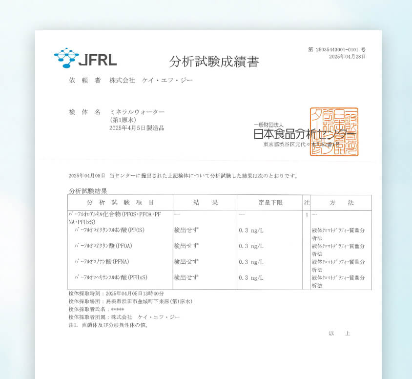 それに、有機フッ素化合物PFASや、放射線に対する検査を定期的に行い、皆様に安心してお飲みいただける天然水をお届けします。